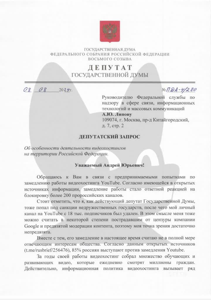 Депутат Госдумы от фракции КПРФ Денис Парфёнов в своём запросе к главе РКН Липову заявил, что замедление Youtube не в полной мере отвечает интересам общества. Коммунист обратил внимание, что сам находится под западными санкциями, его канал с видеохостинга был удалён, а значит, его “тоже можно считать пострадавшим от цензуры компании Google“, однако, согласно опросам, подавляющее большинство россиян выступают против ограничений в отношении Ютуба:
