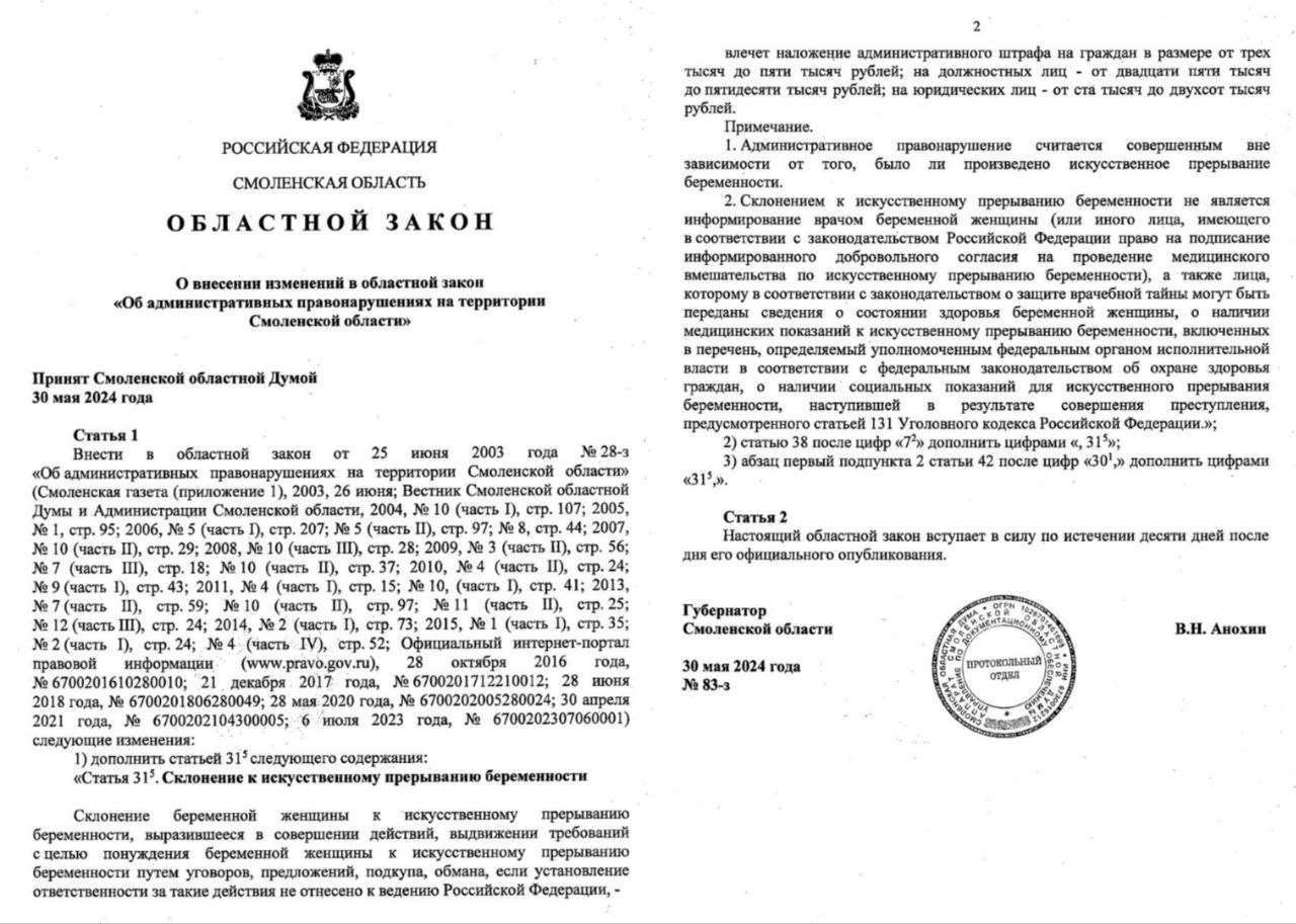 Штрафы за склонение к аборту уже ввели в Вологодской, Тверской, Псковской, Новгородской, Курской и Калининградской областях, а также в Мордовии и Забайкальском крае. Власти Челябинской, Липецкой и Курской областей, а также Татарстана и Крыма сообщали о добровольном отказе частных клиник от проведения абортов.