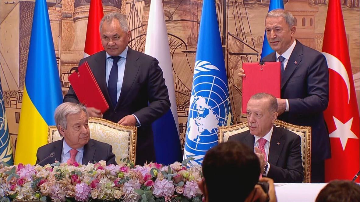 Ради этого в Турцию прибыл министр обороны РФ Сергей Шойгу. В мероприятии также приняли участие президент Турции Реджеп Эрдоган и генеральный секретарь ООН Антониу Гутерриш. Ранее такой же документ Турция и ООН подписали с Украиной — это сделано специально, чтобы представители Украины и РФ не контактировали напрямую.