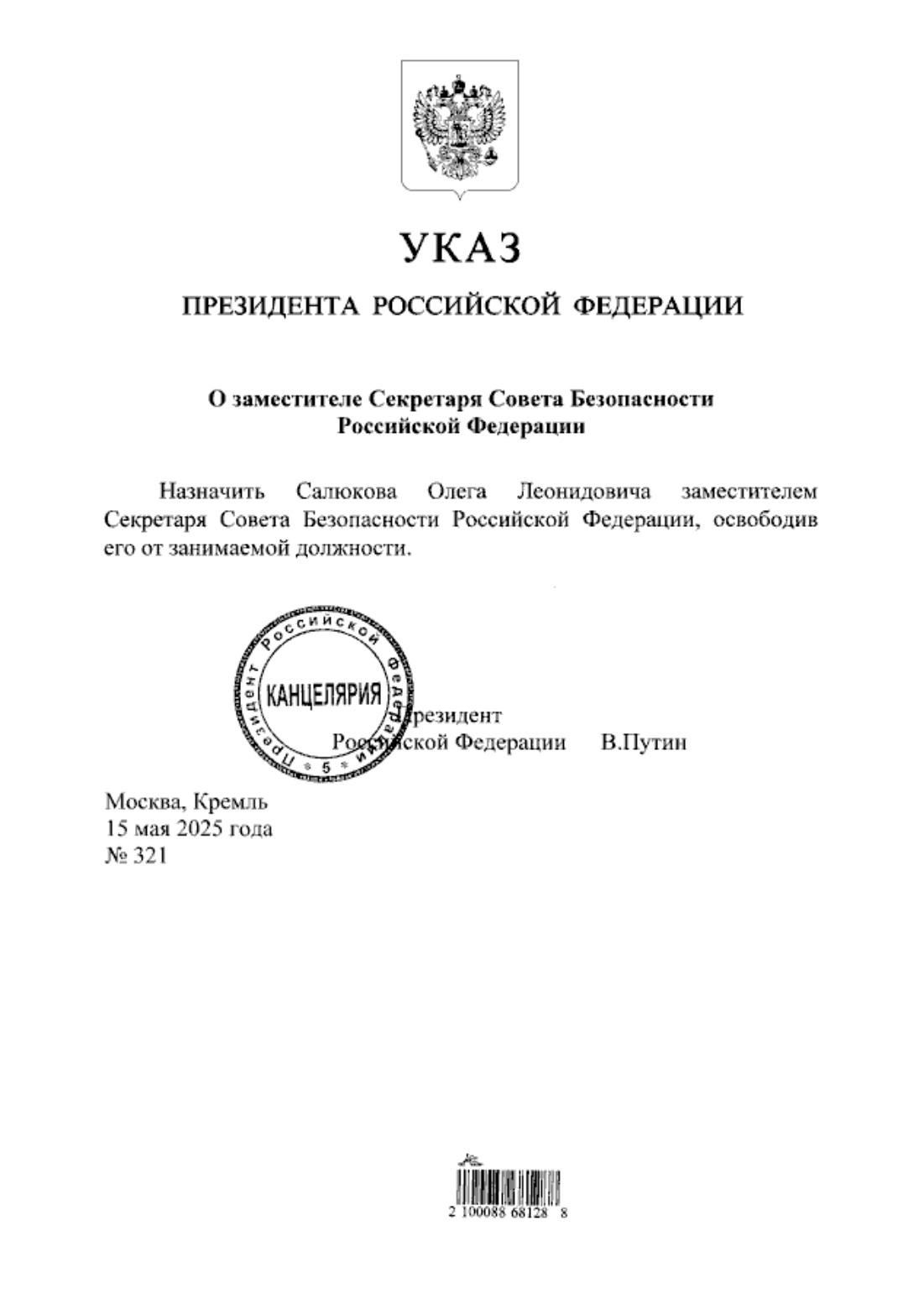 Указ подписал Владимир Путин. Генерал армии станет заместителем Шойгу в Совбезе РФ. Салюков открывал Парад победы на Красной площади последние годы и докладывал о его ходе министру обороны.