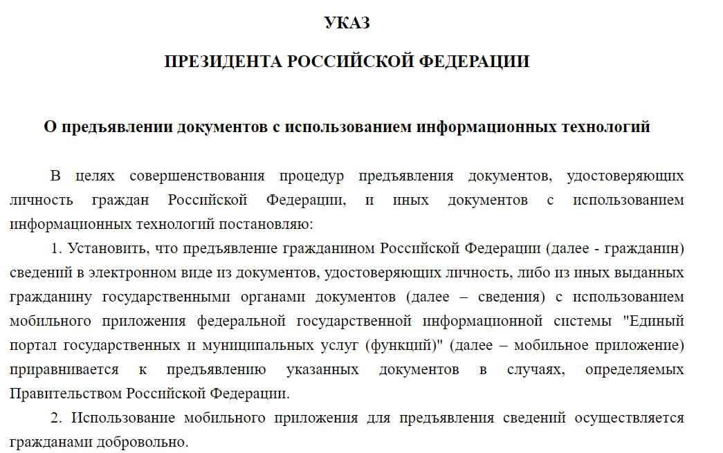 Согласно проекту, министерство предлагает приравнять предъявление документов из сервиса “Госуслуги” к предъявлению их оригиналов. Под действие указа могут попасть и удостоверения личности — паспорта и свидетельства о рождении.