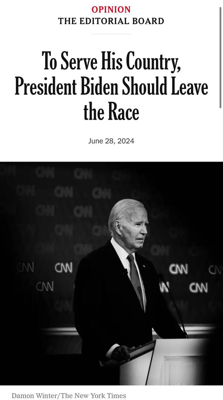Редакционная коллегия американской газеты The New York Times опубликовала заявление с заголовком «Чтобы служить своей стране, президент Байден должен покинуть гонку». Журналисты издания считают, что действующий президент «уже не тот, каким был четыре года назад», и опасаются, что он не сможет победить Дональда Трампа на президентских выборах. NYT призывает Байдена уступить место более «убедительному» и «энергичному» кандидату от демократов.