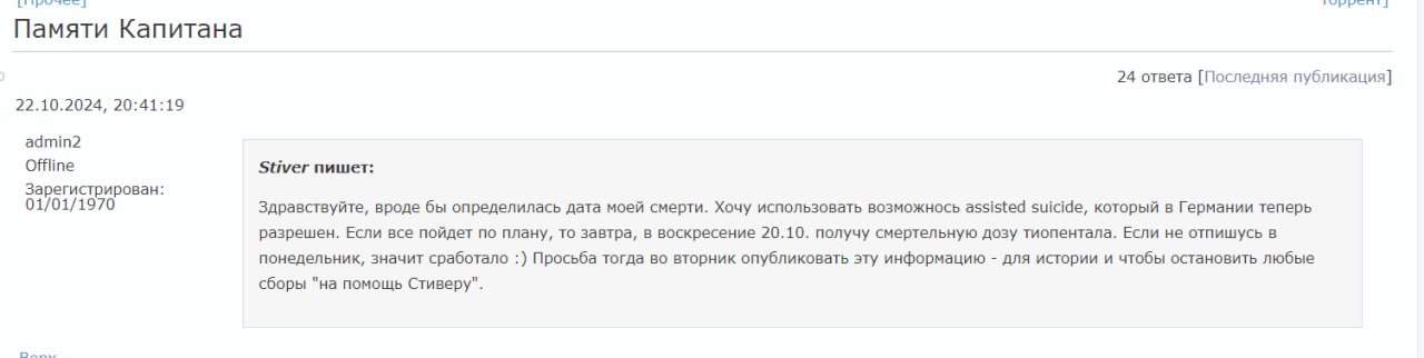 Основатель сервиса Stiver написал предсмертный пост, согласно которому он намерен сделать в Германии ассистированный суицид (с помощью другого человека): «Если все пойдет по плану, то завтра, в воскресение 20.10. получу смертельную дозу тиопентала. Если не отпишусь в понедельник, значит сработало :)». Сегодня вечером публикация от имени создателя проекта появилась на сайте.