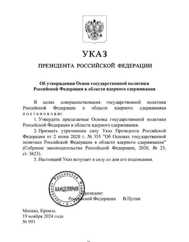 Согласно документу, решение о применении ядерного оружия принимается президентом. Кроме того, агрессия любого государства из военной коалиции против России или ее союзников рассматривается как агрессия этой коалиции в целом.