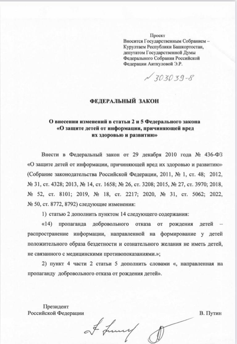 В пояснительной записке сказано, что “сторонники идеологии «чайлдфри» распространяют идеи, формирующие основу деструктивного социального поведения, базирующегося на добровольном отказе от рождения детей, что идёт вразрез с традиционными семейными ценностями и государственной политикой РФ”.