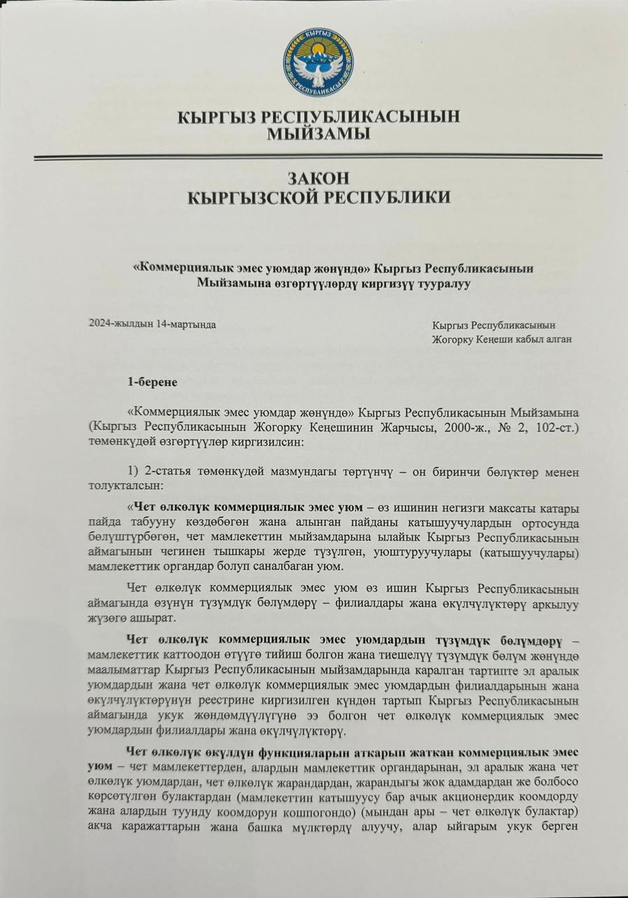 Указ о создании реестра подписал президент республики Садыр Жапаров. По его словам, закон принят, чтобы «все работали на равных условиях, и он пойдет на пользу Кыргызстану. Жапаров также пообещал не преследовать организации, объявленные иноагентами. «Вы на протяжении 30 лет работаете с иностранными донорами, и вас никто не преследовал за то, что вы брали какие-то суммы. Сейчас что-ли начнем это делать? Я как глава государства гарантирую, что никаких преследований не будет. Мы не ядерная страна. Мы пока не собираемся летать в космос. У нашего государства нет секретов, которые нужно скрывать от вас и ваших доноров», — заявил в соцсетях Жапаров.