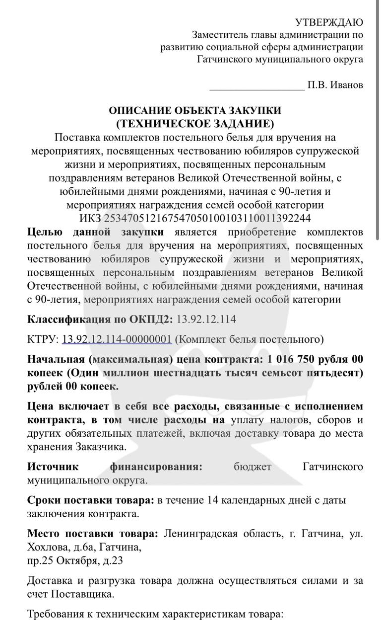 Гатчинский муниципальный округ закупает комплекты для вручения юбилярам супружеской жизни, ветеранам Великой Отечественной войны с 90-летия и семьям особой категории. Поставщик должен будет доставить бельё в течение 14 дней после подписания контракта.