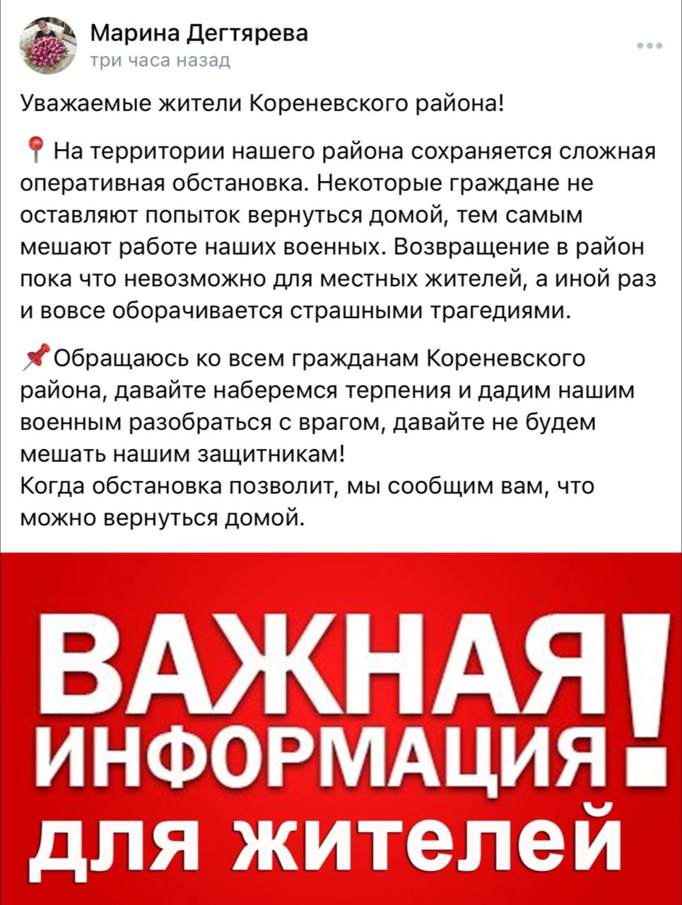 — Обращаюсь ко всем гражданам Кореневского района, давайте наберемся терпения и дадим нашим военным разобраться с врагом, давайте не будем мешать нашим защитникам!