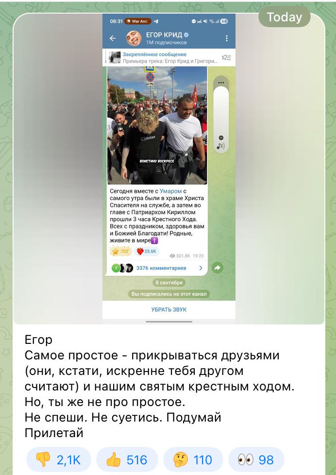 Вчера Вячеслав Федорищев обратился к музыканту из-за ситуации с “очень уважаемым мной руководителем и девушкой”. Он пригласил Крида в регион, чтобы объяснить ему, почему он не прав. Сегодня в 7 утра Федорищев выложил скриншот поста Крида, в котором тот вместе с президентом Международной ассоциации бокса Умаром Кремлевым принял участие в проведении крестного хода в Москве. В посте он обвинил музыканта в том, что он прикрывается друзьями и “нашим святым крестным ходом”. “Но, ты же не про простое. Не спеши. Не суетись. Подумай Прилетай”, – написал он.