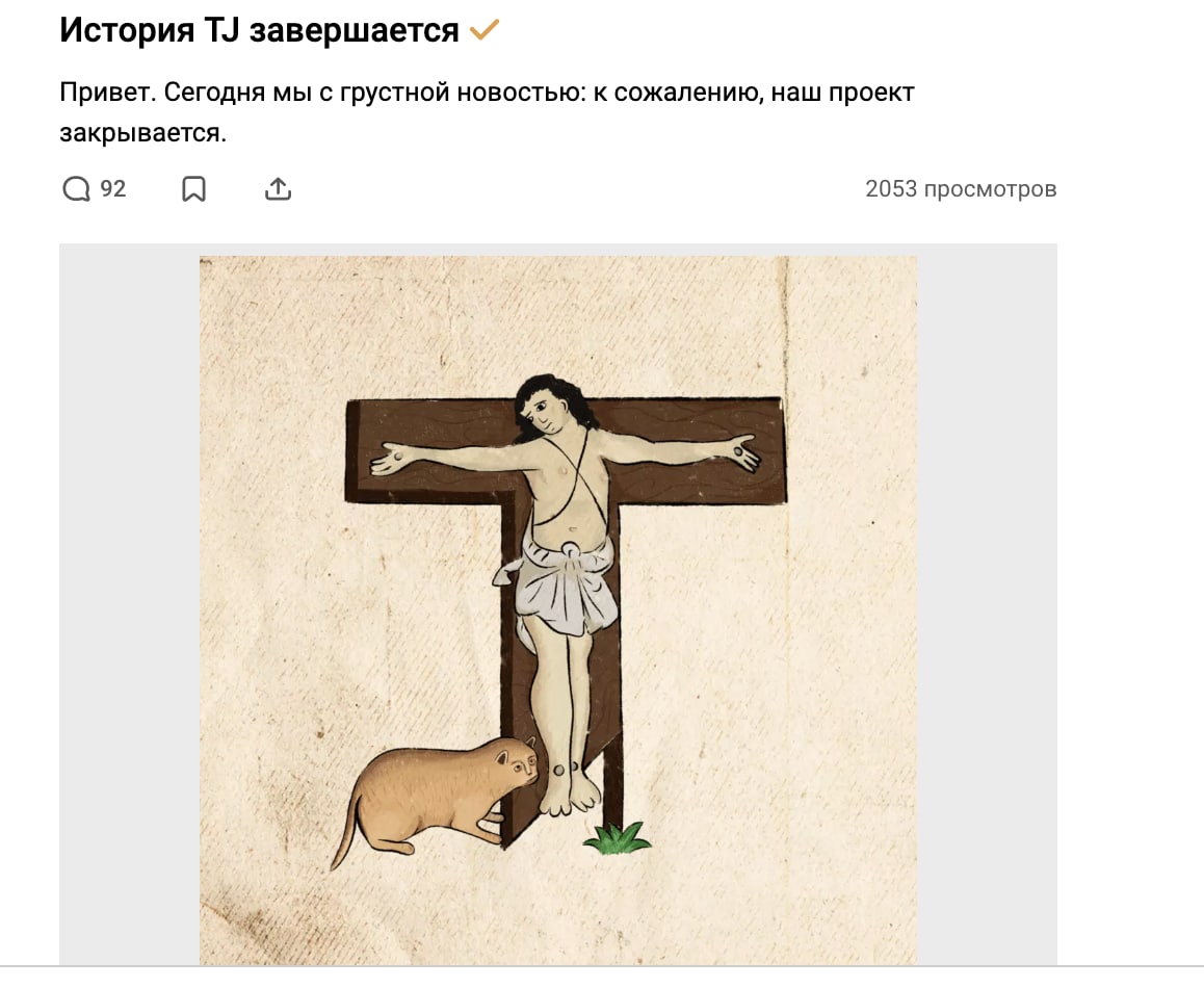 “У нас закончились средства для развития и поддержки проекта. После начала войны компания «Комитет», которая владеет TJ, потеряла существенную часть рекламной выручки. С марта 2022 года мы начали резко прожигать свои запасы. Через несколько месяцев вынужденные сокращения коснулись всех подразделений, от редакций до разработки”, — сообщает команда.