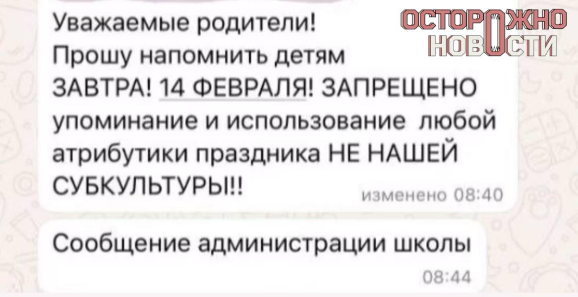 Накануне 14 февраля родителей учеников школы № 102 в Губернском микрорайоне предупредили, что детям запрещено праздновать День всех влюблённых. В сообщении также говорится, что нельзя упоминать и использовать любую атрибутику «праздника не нашей субкультуры». Распоряжение поступило от администрации школы.