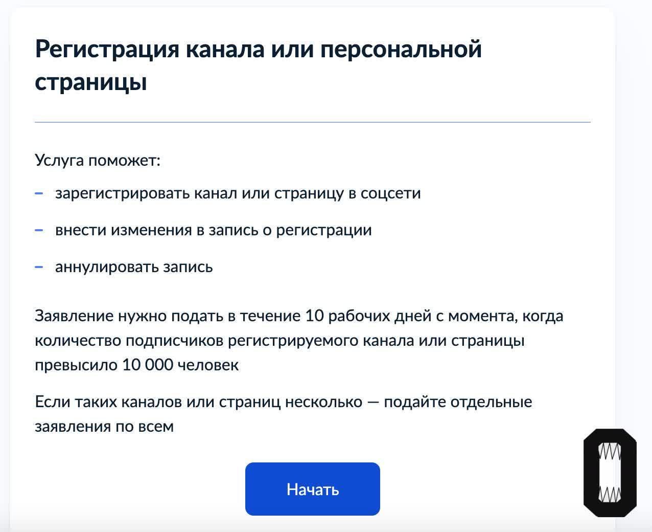 После идентификации каналы будут включаться Роскомнадзором в специальный перечень. Минцифры сообщает, что регистрация в системе доступна как для физических, так и для юридических лиц и ИП. Ведомство также описало шаги для подачи заявки — владельцы отправляют через специальную форму данные о себе и своём канале, включая контактные данные. После этого получают уникальный номер, который в течение 3 дней нужно разместить в закреплённом сообщении или описании канала, чтобы чиновники проверили принадлежность страницы автору заявки.