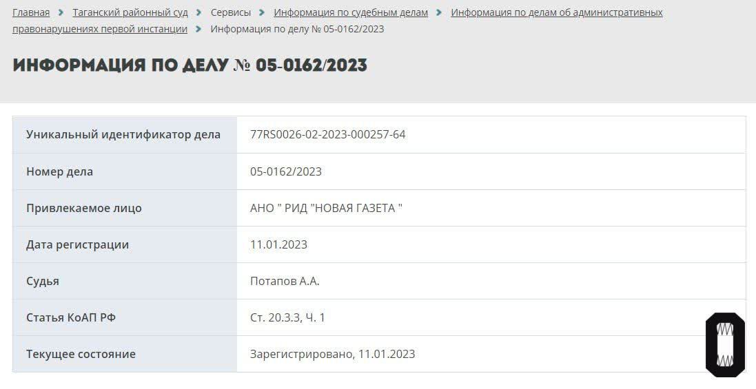 «Осторожно, новости» обнаружили, что административное дело поступило в Таганский суд, дата заседания по нему не назначена. Из-за какого материала на издание составили протокол, неизвестно.