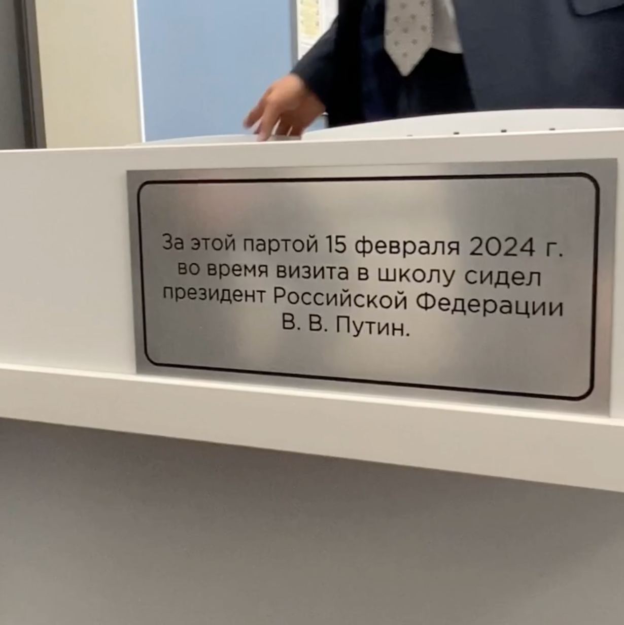12 апреля депутаты Заксобрания Свердловской области посетили учебное заведение, экскурсию им провел мэр Владислав Пинаев. “В учебном заведении они с удовольствием провели тест-драйв парты, за которой сидел президент Владимир Путин во время своего визита”, — пишет издание. Табличку можно увидеть на ролике, который опубликовал мэр после завершения рабочего визита депутатов.