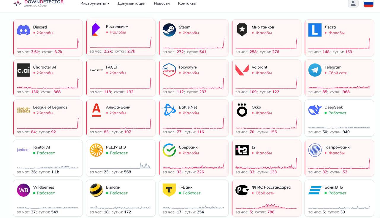 По данным сервиса Downdetector, не работают сайты онлайн-кинотеатров, банков и соцсетей, а также нескольких игровых платформ. На сбои в особенности жалуются жители Москвы, Санкт-Петербурга, Самарской области.