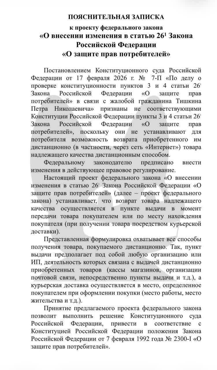 Ранее Конституционный суд (КС) России обязал магазины принимать возврат товаров любым удобным для покупателя способом, в том числе дистанционно. Федеральному собранию было поручено внести изменения в законодательство.