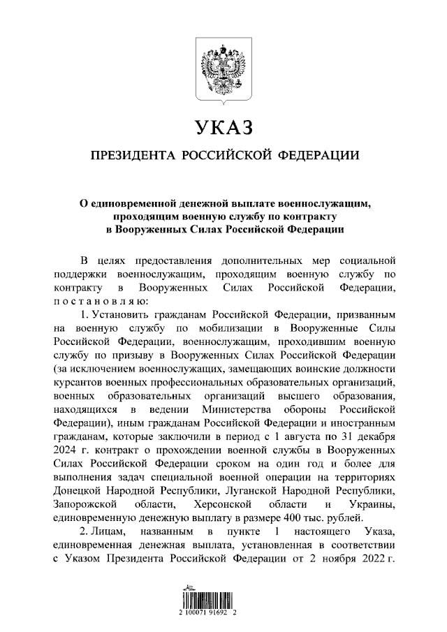 При этом в указе властям регионов рекомендовано выплачивать контрактникам еще по 400 тысяч рублей. Ранее в российских регионах начали увеличивать размер выплат за подписание контракта — например, правительство Москвы установило “меры социальной поддержки” в размере 1,9 миллиона рублей. Это единовременная дополнительная выплата для всех, кто подпишет контракт в городских пунктах отбора на военную службу с 23 июля. В Татарстане также на полмиллиона рублей увеличили выплату желающим подписать контракт до 31 июля, теперь она может доходить до 1,5 млн рублей.