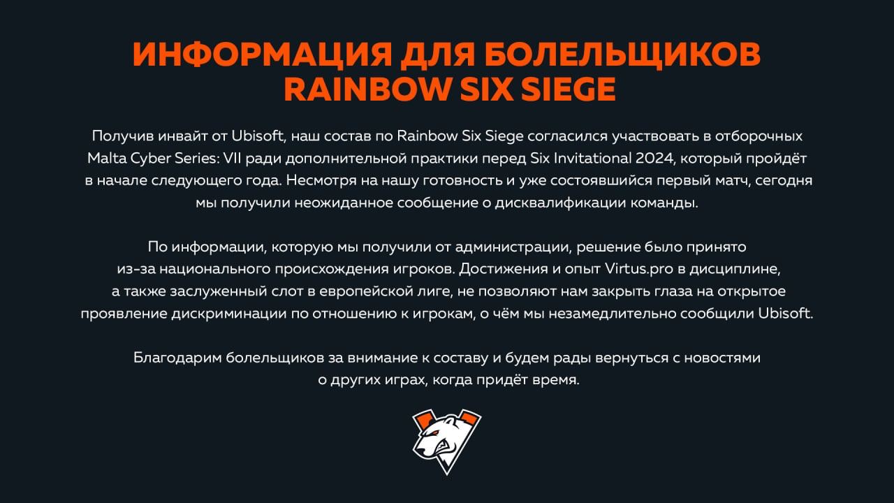 Представители команды заявили, что получили инвайт на отборочные соревнования Malta Cyber Series: VIl от от Ubisoft (разработчиков игры). «Несмотря на нашу готовность и уже состоявшийся первый матч, сегодня мы получили неожиданное сообщение о дисквалификации команды. По информации, которую мы получили от администрации, решение было принято из-за национального происхождения игроков», — заявили в Virtus.pro.