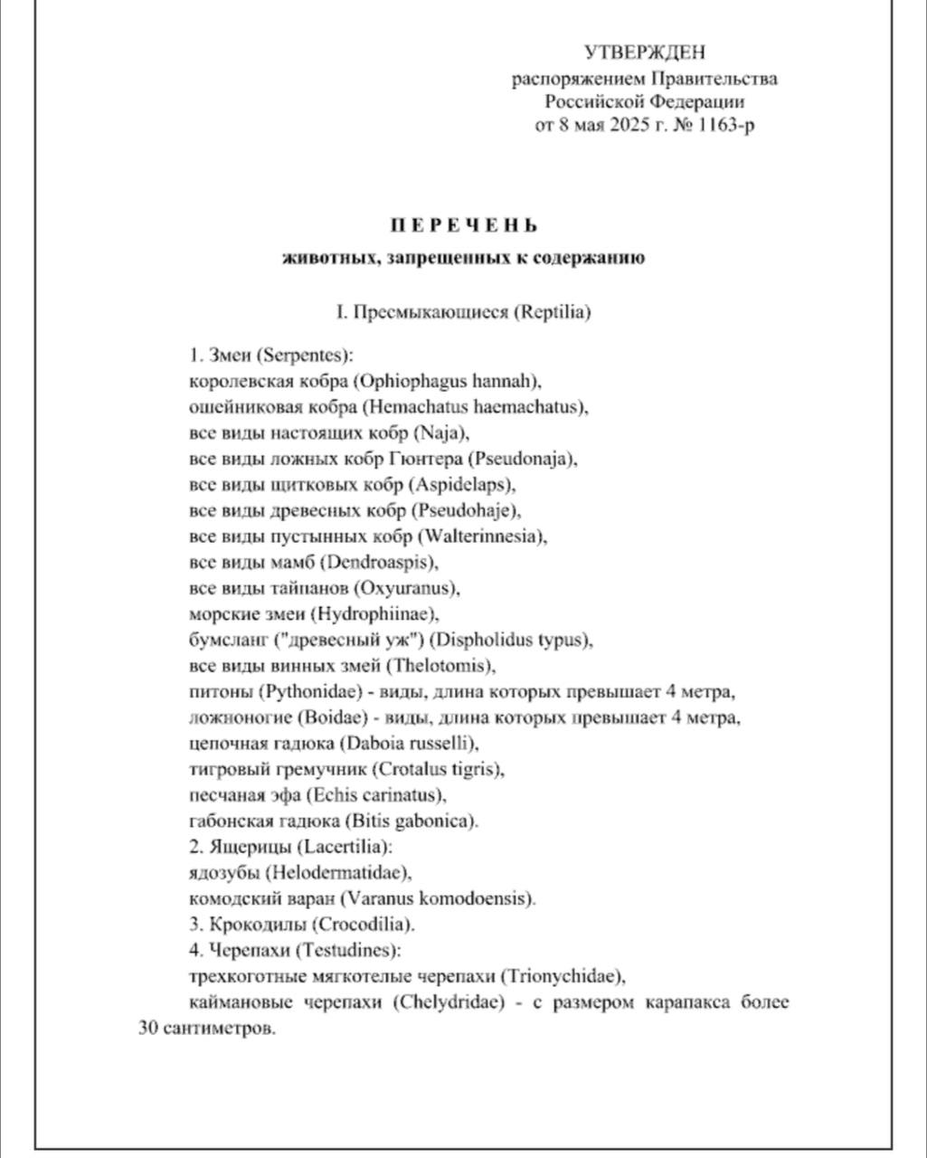 Правительство России утвердило перечень из 121 разновидности животных, которые запрещены к содержанию дома. Распоряжение вступит в силу с 1 сентября 2025 года и будет действовать шесть лет.