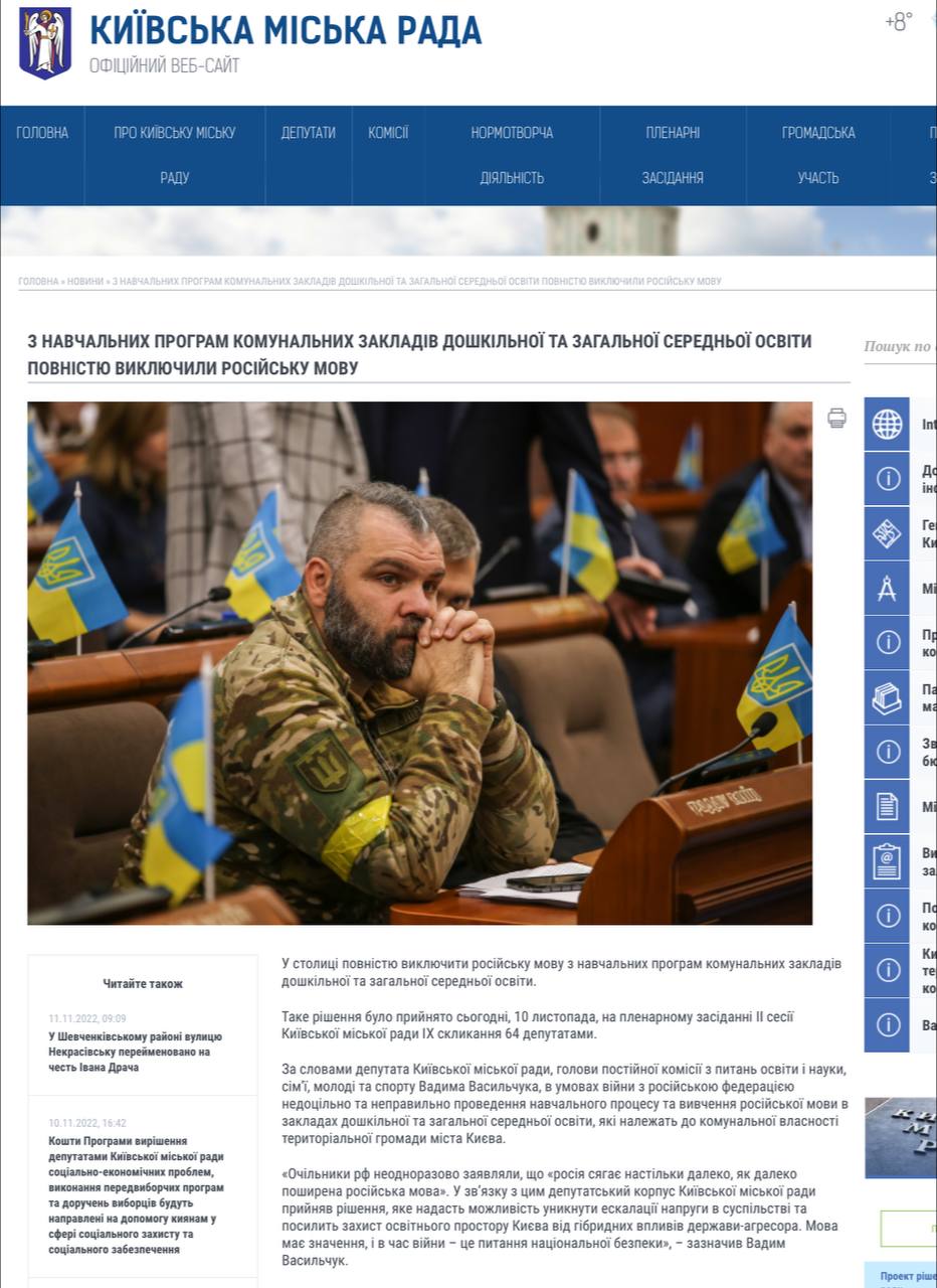 За это решение на пленарном заседании проголосовали 64 депутата горсовета. По словам председателя комиссии по вопросам образования и науки, семьи, молодежи и спорта Вадима Васильчука, «в условиях войны нецелесообразно и неправильно проведение учебного процесса и изучение русского языка».