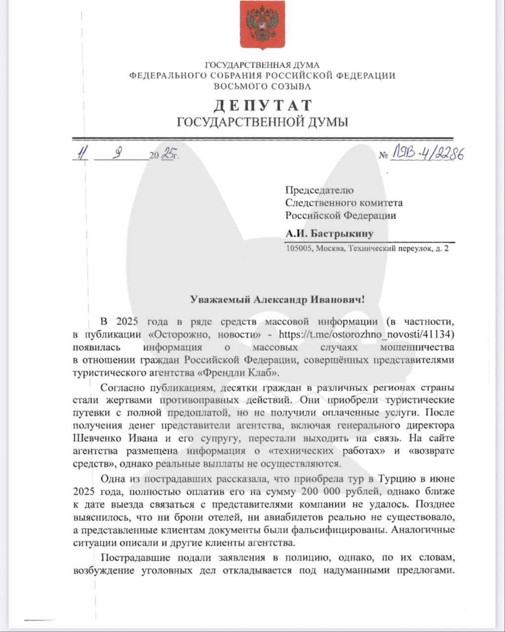В документах на имя председателя СКР Александра Бастрыкина и первого заместителя генпрокурора Анатолия Разинкина депутат просит провести проверку в отношении владельцев агентства на наличие связей с правоохранителями. Обманутые клиенты пытались написать заявления в полицию, но в возбуждении уголовного дела им отказали, обращает внимание Лантратова.