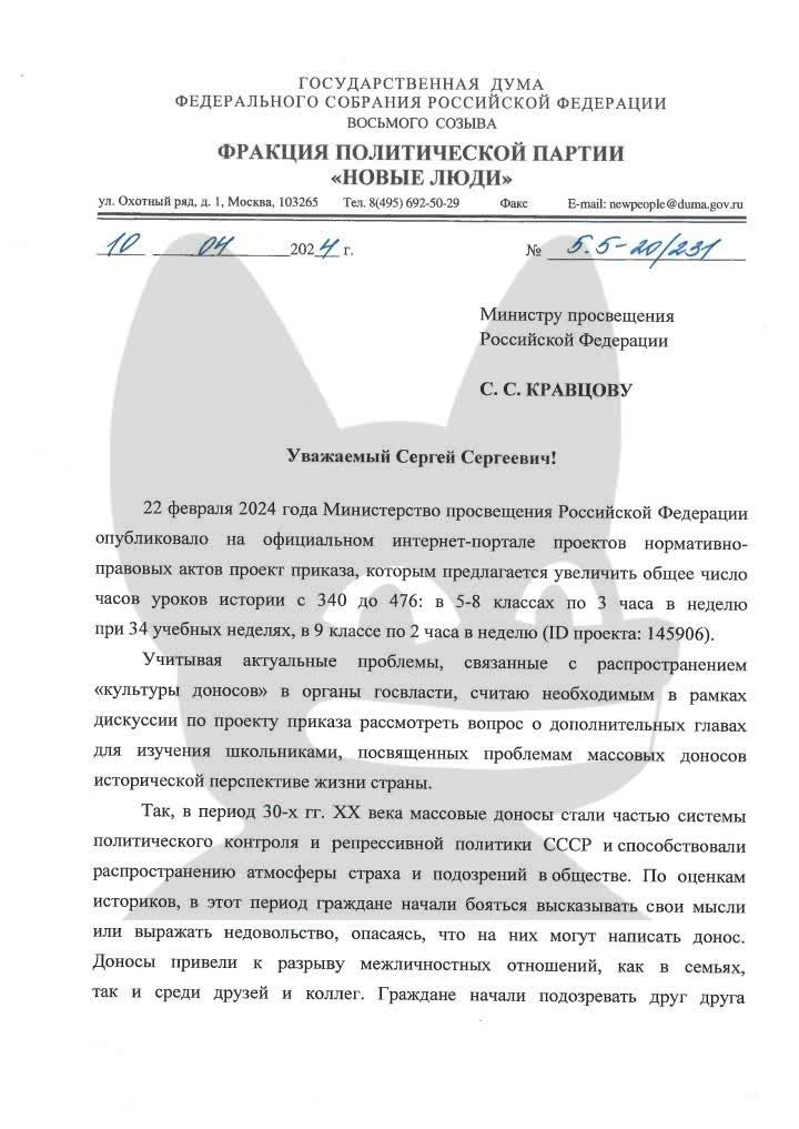 По мнению депутата от “Новых людей“, в расширенный курс истории необходимо включить дополнительные главы, посвящённые проблемам массовых доносов в исторической перспективе жизни страны: