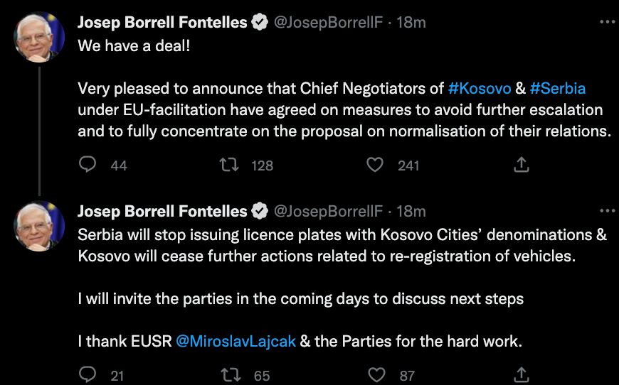 Глава европейской дипломатии Жозеп Боррель сообщил, что Сербия и Косово достигли соглашения по проблеме автомобильных номеров и предотвращению эскалации.